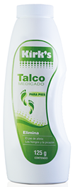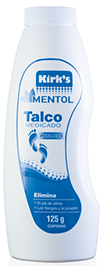 Talco Kirk's MentolTalco medicado y refrescante, eficaz en la eliminación de hongos, picazón y pie de atleta. |