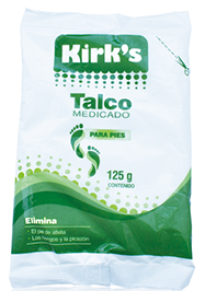 Talco Kirk'sTalco medicinal, efectivo en la eliminación de hongos, picazón y pie de atleta. |